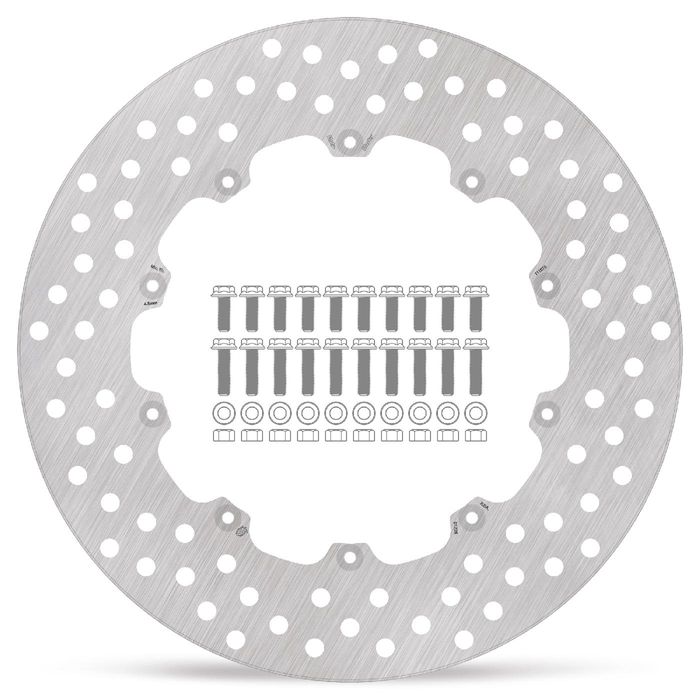 The Moto-Master HALO Series sets a new standard in aftermarket circular-round design brake rotors. Its premium quality stainless steel outer ring allows for high performance braking while at the same time extremely durable. Exact size and positioning of the venting holes ensures equal heat dispersion under high thermal stress while the brake pad contact surface is cleaned evenly. The laser cut and precision grinded outer ring is fixed to a billet CNC machined aircraft aluminium carrier which is black anodized and laser marked. Newly designed lightweight stainless steel floaters complete the package. Halo Road Disc is also available in Halo Racing version in 5.5mm thickness. For best performance we recommend using Moto-Master brake pads. All Moto-Master Discs are TÜV approved.