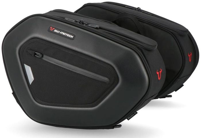 The PRO BLAZE HIGH saddlebags with removable support arms impress with a sporty look, low weight and a clever fastening system. SW-MOTECH manufactures the bags from robust and especially UV-resistant 1680D Ballistic Nylon. In combination with side panels made of dimensionally stable EVA material, the luggage is protected from splashing water and dust. Developed specifically for sporty motorcycles, the saddlebags have minimal effect on handling performance. When travelling without luggage, the removable support arms can be detached with a simple step, leaving only inconspicuous holders behind on the bike. PRO BLAZE saddlebags with bike-specific support arms allow you to convert sporty bikes to touring motorcycles in seconds Light weight and sporty look Side walls made of dimensionally stable, laminated EVA plastic Made from durable, highly UV-resistant 1680D ballistic nylon with water resistant interior coating A powerful Velcro strap additionally secures the left and right saddlebags and offsets the weight of the luggage Upper side of the Velcro strap covered with anti-slip material for a secure hold on the passenger seat Zippered volume expansion Main pocket is loaded from the top Outer pocket with covered zipper MOLLE attachment made of sturdy Hypalon material on the front for accessory bags Practical carrying handle Reflective details for more safety in traffic