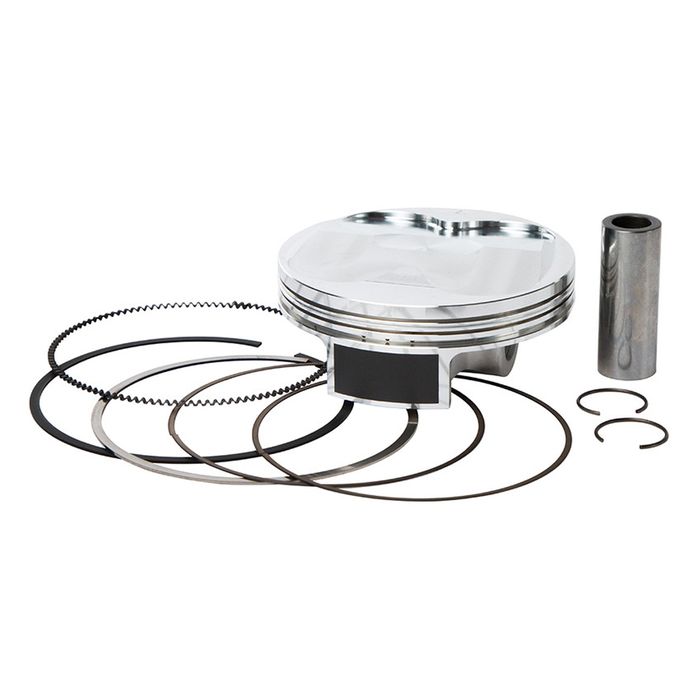 Vertex piston kits include the piston, rings, wrist pin, and circlips. The pistons are heat-treated with a T-6 hardening and tempering cycle. Also, a molybdenum disulphide skirt coating is used for reducing wear and improving the break-in phase of each piston.