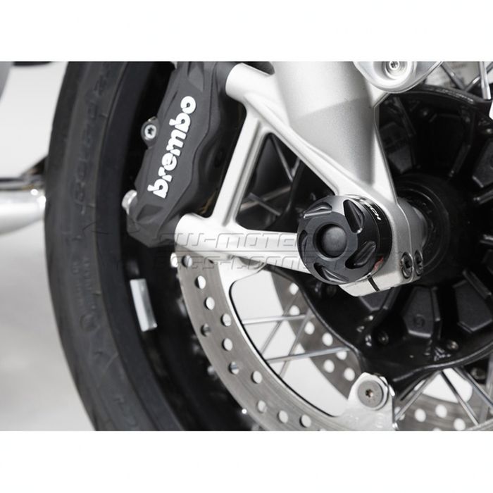 Front Axle Slider Kit SW Motech These crash pads made of abrasion-resistant plastic provide additional safety for the drive shaft: the 50-millimeter diameter creates a large contact surface for the best possible force distribution. With their shapely design, the pads fully match the look of the motorcycle. All parts required for assembly are included in delivery.