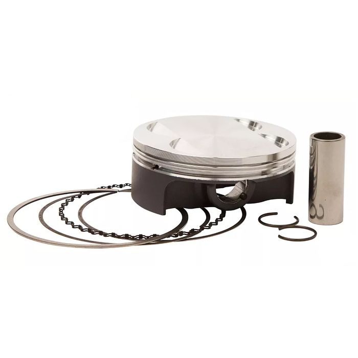 Vertex piston kits include the piston, rings, wrist pin, and circlips. The pistons are heat-treated with a T-6 hardening and tempering cycle. Also, a molybdenum disulphide skirt coating is used for reducing wear and improving the break-in phase of each piston.