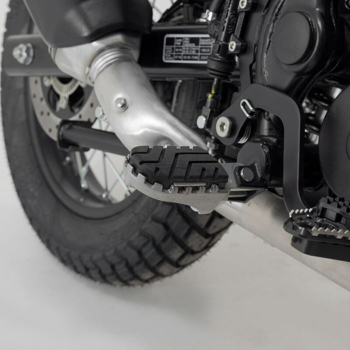 Our reasonably priced ION footrest kits allow the footrest to be mounted at its original height or lowered by 15 mm. Extremely durable and built to last, these stainless-steel footrests provide plenty of extra grip and are recommended for adventure, offroad and urban motorcycles. Hinges made from high-strength aluminum alloy ensure that the footrest can fold out of the way if the bike tips over. The removable rubber top surface reduces vibration, and the profile gives you a firm grip during offroad riding. To mount the bike-specific hinge adapter to the footrest sockets, the original attachments (springs, bolts, etc.) are used.