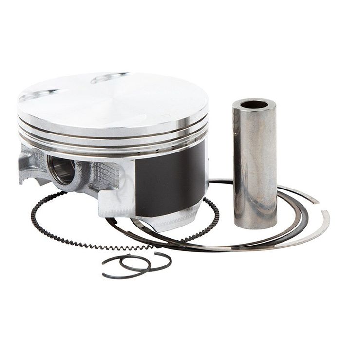 Vertex piston kits include the piston, rings, wrist pin, and circlips. The pistons are heat-treated with a T-6 hardening and tempering cycle. Also, a molybdenum disulphide skirt coating is used for reducing wear and improving the break-in phase of each piston.