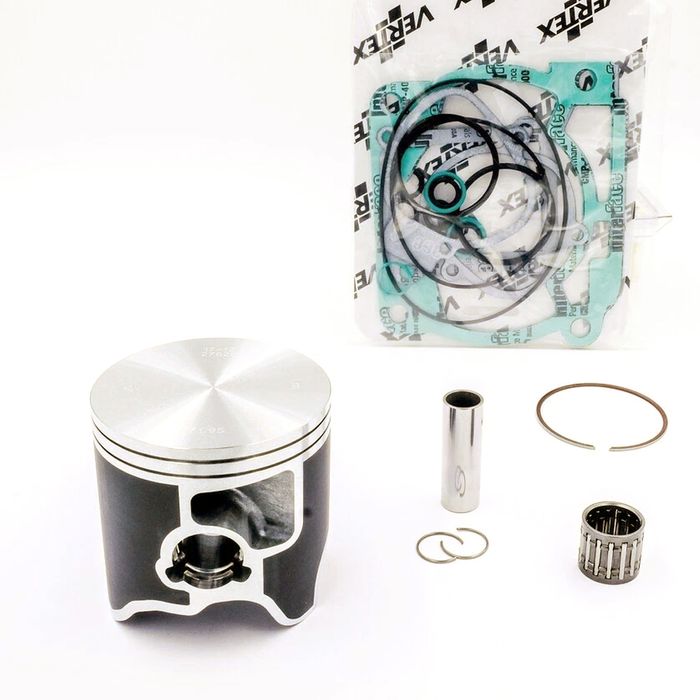 Vertex piston kits inc the piston, rings, wrist pin and circlips. The pistons are heat-treated with a T-6 hardening and tempering cycle. Also, a molybdenum disulphide skirt coating is used for reducing wear and improving the break-in of each piston.