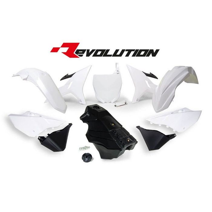 Rtech REVOLUTION Plastics Kit Vented front Fender, Rear Fender , Radiator Shrouds REVOLUTION, Sidepanels REVOLUTION, Airbox Sidepanels REVOLUTION, Front Number plate & adaptor, Petrol Tank 8.5litre, Petrol Cap & Screws kit White
