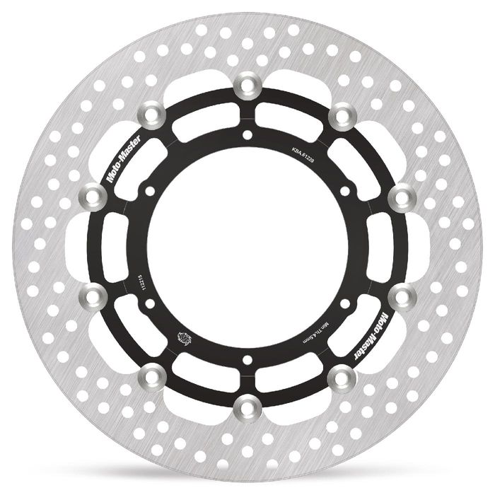 The Moto-Master HALO Series sets a new standard in aftermarket circular-round design brake rotors. Its premium quality stainless steel outer ring allows for high performance braking while at the same time extremely durable. Exact size and positioning of the venting holes ensures equal heat dispersion under high thermal stress while the brake pad contact surface is cleaned evenly. The laser cut and precision grinded outer ring is fixed to a billet CNC machined aircraft aluminium carrier which is black anodized and laser marked. Newly designed lightweight stainless steel floaters complete the package. Halo Road Disc is also available in Halo Racing version in 5.5mm thickness. For best performance we recommend using Moto-Master brake pads. All Moto-Master Discs are T?V approved.