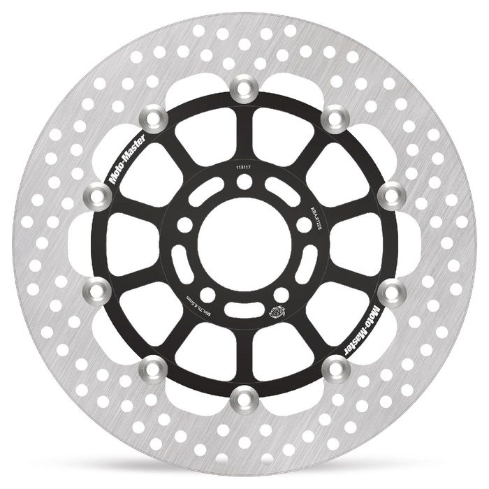 The Moto-Master HALO Series sets a new standard in aftermarket circular-round design brake rotors. Its premium quality stainless steel outer ring allows for high performance braking while at the same time extremely durable. Exact size and positioning of the venting holes ensures equal heat dispersion under high thermal stress while the brake pad contact surface is cleaned evenly. The laser cut and precision grinded outer ring is fixed to a billet CNC machined aircraft aluminium carrier which is black anodized and laser marked. Newly designed lightweight stainless steel floaters complete the package. Halo Road Disc is also available in Halo Racing version in 5.5mm thickness. For best performance we recommend using Moto-Master brake pads. All Moto-Master Discs are T&V approved.