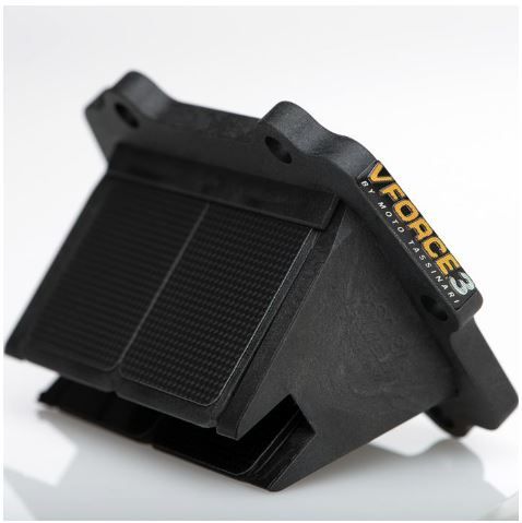 The unique design of the VForce reed valve system features double the reed tip surface over a conventional reed valve design. This has two major benefits: 1) The reed petals only travel half the distance as a conventional reed valve design to get the same airflow. 2) Because the reed petals only need to travel half the distance of that on a conventional reed valve design, there is a greater chance of them being fully opened as well as a better chance of sealing when they are "closed". A reed petal never truly "closes" in a classic sense, as it is always in movement. Consider this, an engine operating at 8,000 RPM results in a reed petal opening and closing 133 times in one second. This fact, sheds light on another VForce advantage. Since the petals are only traveling half the distance, they generally last longer as they receive less wear than the reed petals on a conventional reed valve design.